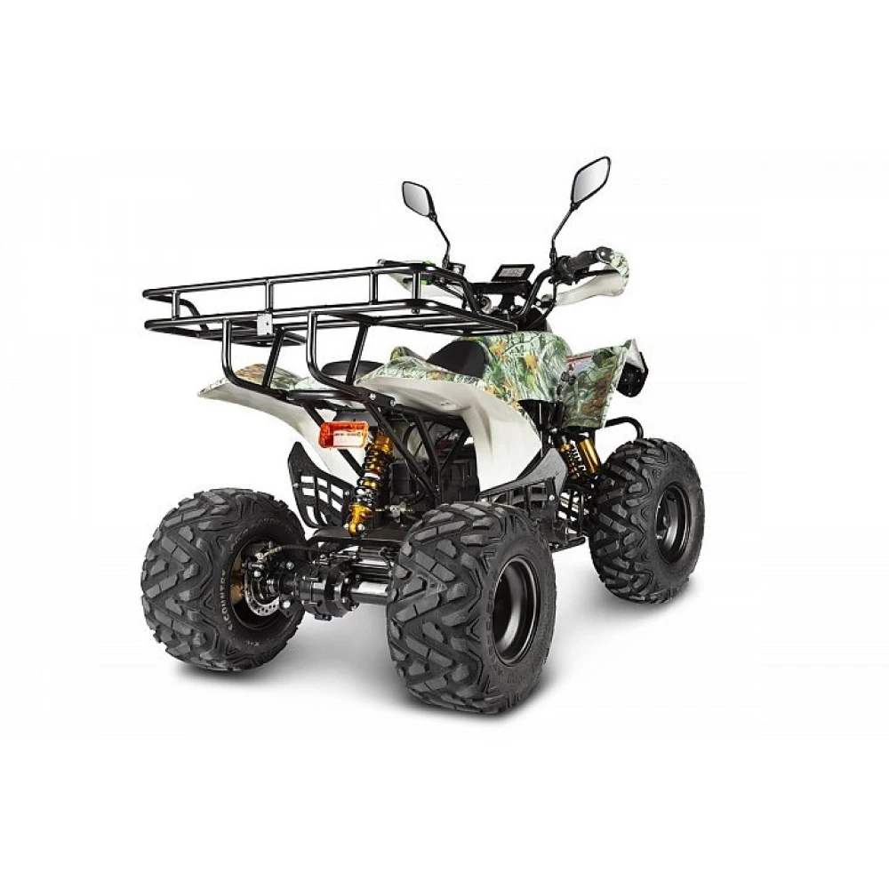 Электроквадроцикл укомплектован багажником, зеркалами заднего вида, охранной сигнализацией, безотказной тормозной системой.