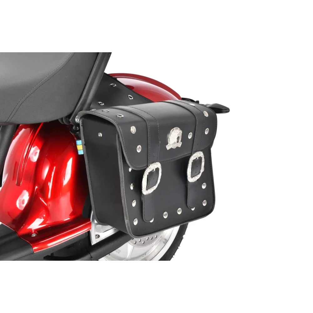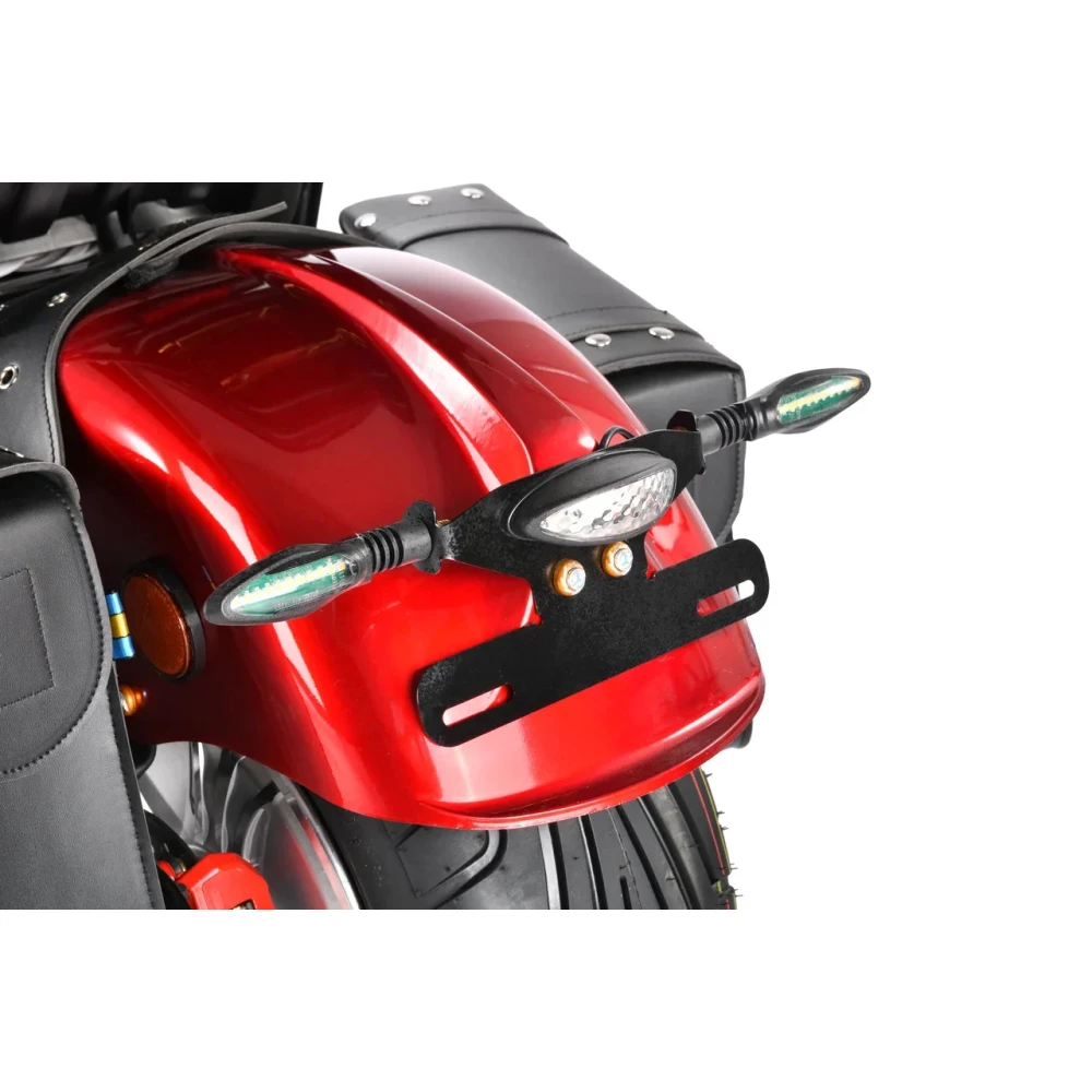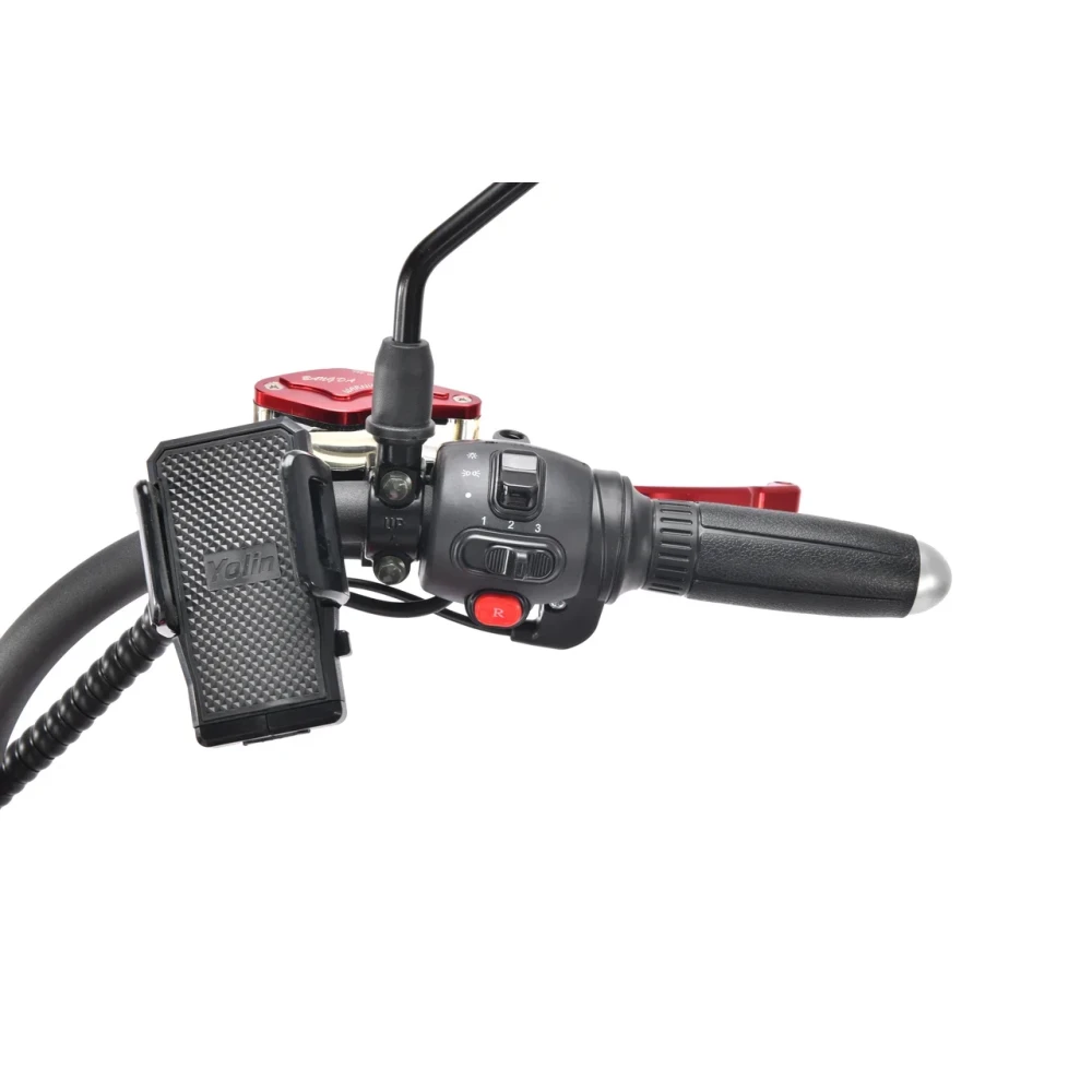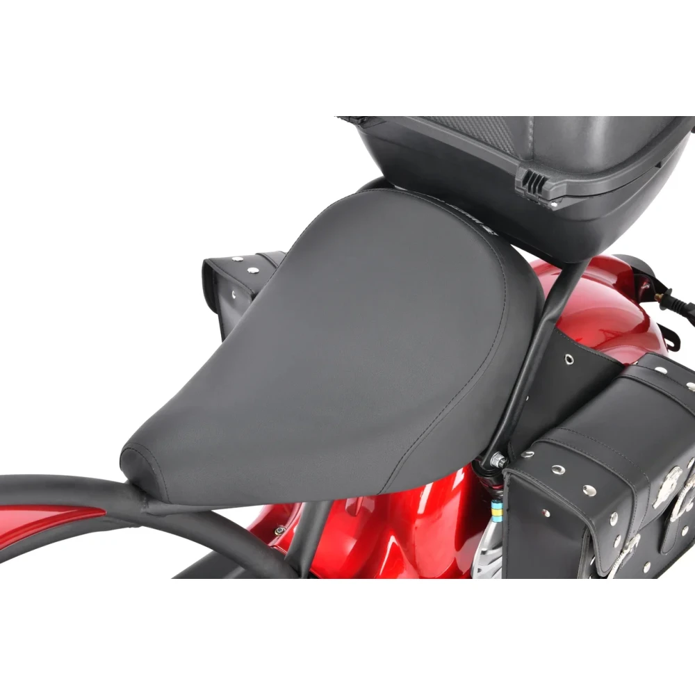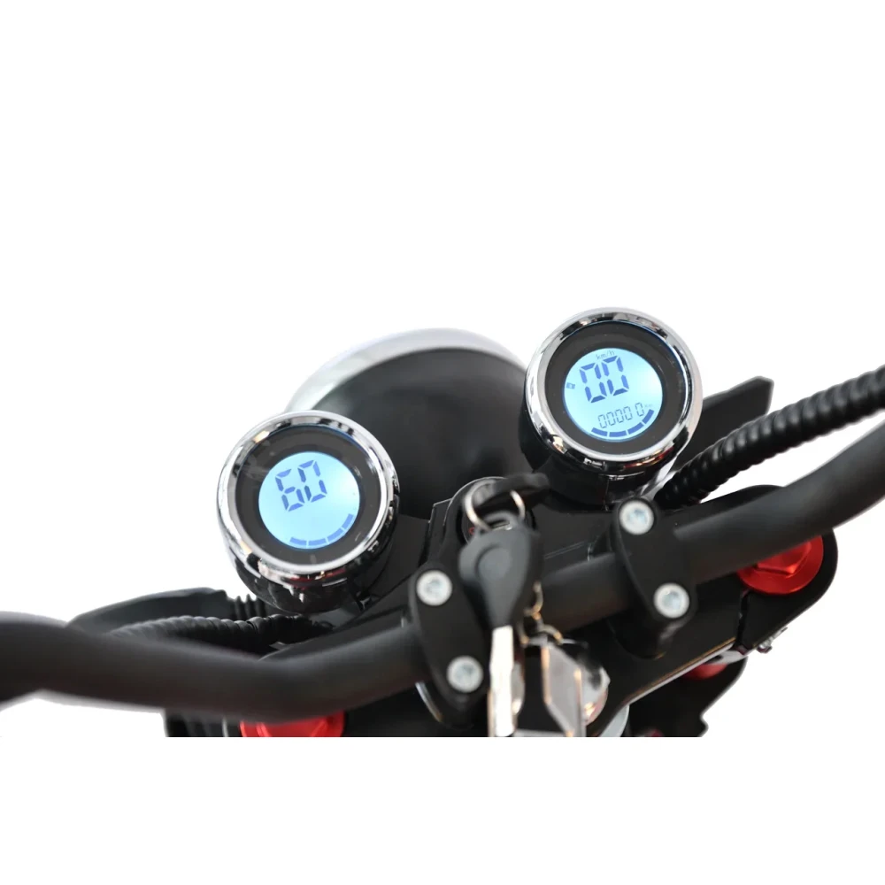 Электроскутер Citycoco WS Wild Wheel 3950W производит впечатление своим незаурядным дизайном, напоминающим мотоцикл чоппер. Сочетание черного корпуса и красных элементов выгодно выделяет данную модель в потоке городского транспорта. Технические характеристики порадуют любителей быстрой езды. Мощный мотор 3950 W позволяет развивать максимальную скорость 71 км/час и легко преодолевать подъемы. При этом электроскутер остаётся экологически чистым транспортом, не требующим использования какого-либо топлива. Достаточно зарядить аккумулятор в течение 6 часов и ваш транспорт готов проехать до 40 км пути. Широкие колеса диаметром 12 дюймов создают отличное сцепление с дорогой, позволяя комфортно передвигаться по асфальту, плитке и грунтовому покрытию. Передний и задний амортизаторы эффективно поглощают неровности, снижают вибрацию и тряску, максимально повышая комфорт водителя. Два электронных дисплея позволяют водителю оценить основные показатели движения и остаточный уровень заряда батареи. Электроскутер оснащён встроенной сигнализацией и качественной системой освещения, которая включает яркую переднюю фару, поворотники и стоп-сигналы.