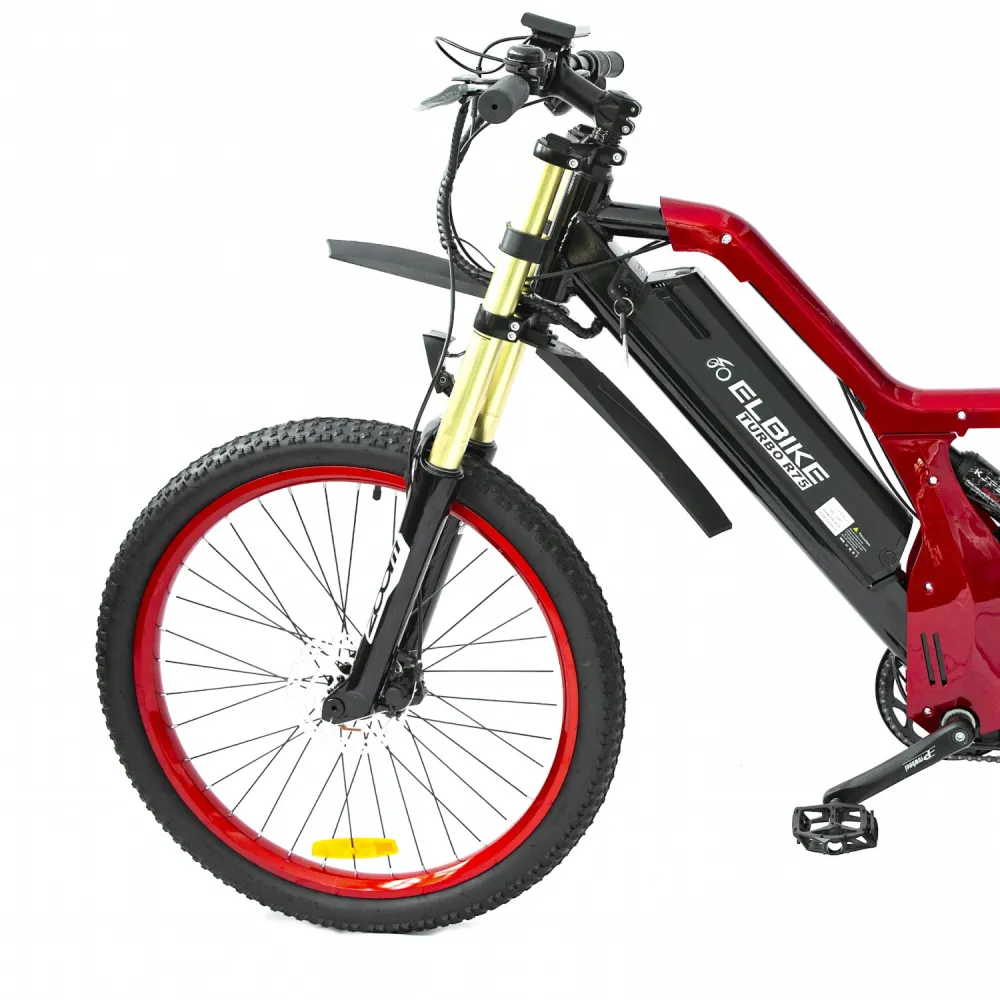 Представляем вашему вниманию электровелосипед Elbike TURBO R65 премиум класса. Значительный размер колёс в 26 дюймов, яркий красный цвет, мощность мотора 500 Вт. Электровелосипед буквально кричит о том, что готов ездить в экстремальных условиях.