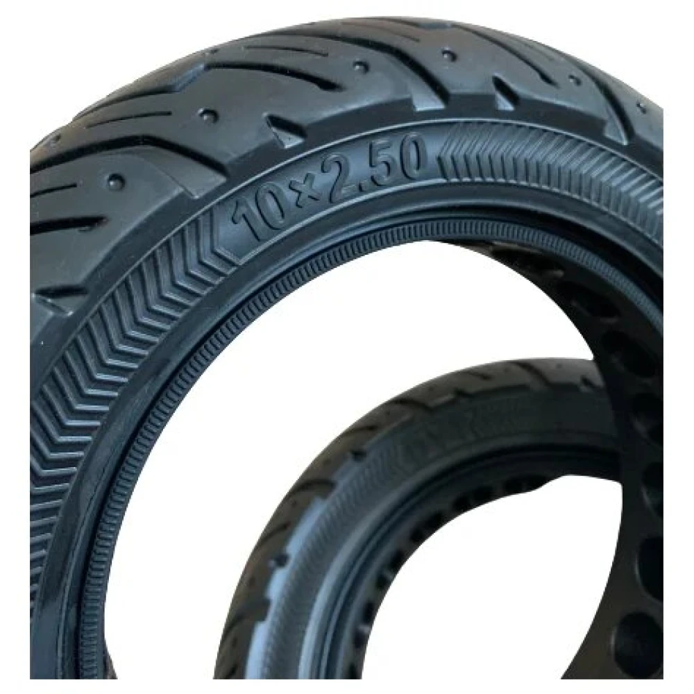 Литая/бескамерная покрышка 10Х2.50 ДЛЯ KUGOO/JOYOR имеет перфорацию для самокатов, что обеспечивает более плавный ход.  Это отличный вариант, если вы хотите кататься не только по ровной дороге, но и по бездорожью, не переживая за проколы колеса.